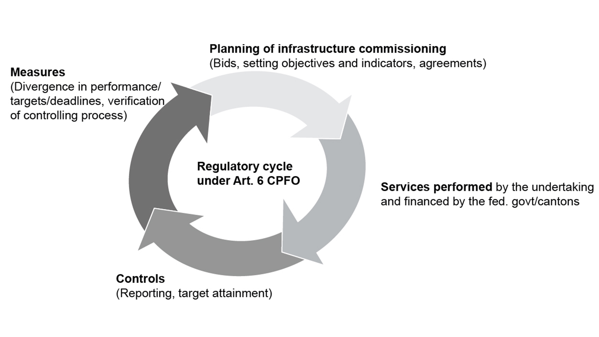 The FOT manages the service level agreements by means of its controlling procedures. Success in achieving the set goals is measured quantitatively via results-oriented indicators, but the railways are also required to report on other objectives (network condition, utilisation and load of the network, ETCS, etc.). The IMs must submit a report at least every six months on progress towards achieving the objectives and the status of the agreed investment projects. The FOT can order measures to ensure that targets are met or demand the return of financial benefits if the services commissioned are not provided as agreed, or if targets or deadlines are not met.