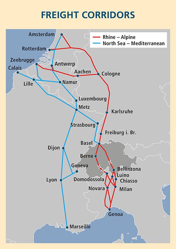 Of particular importance for Switzerland are the Rhine‒Alpine corridor between Rotterdam and Genoa (via Lötschberg‒Simplon and Gotthard‒Ceneri) and the North Sea‒Mediterranean corridor between Antwerp and Lyon or Basel.