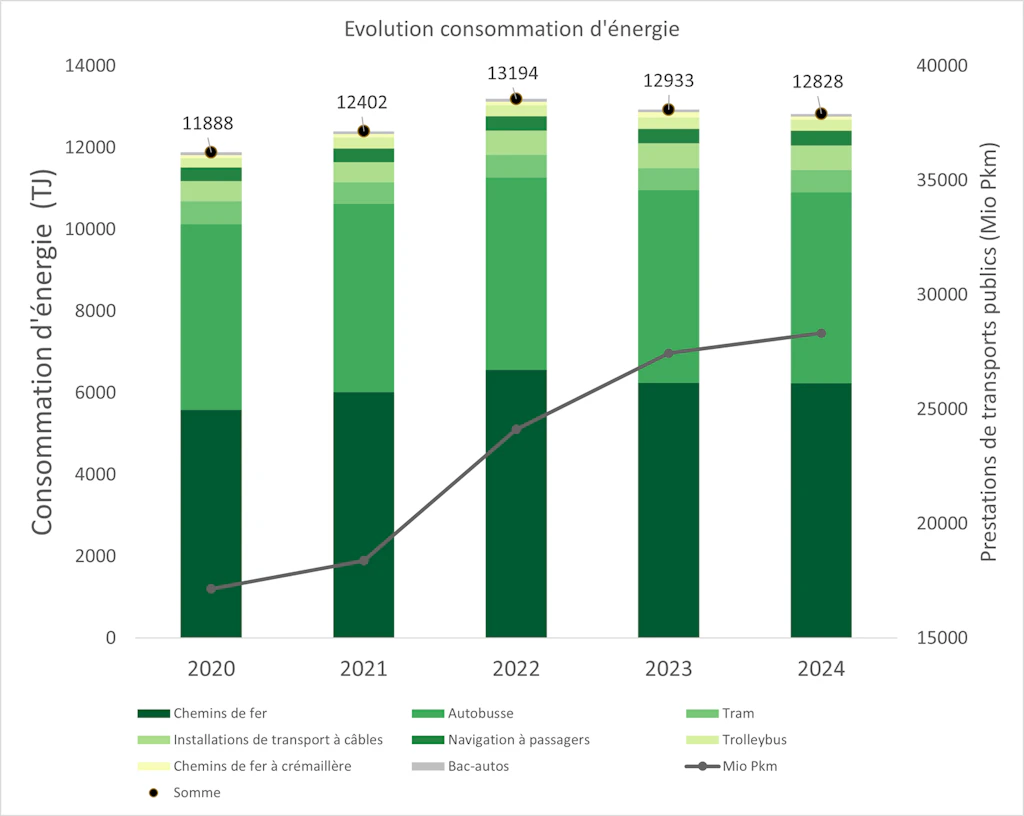 Entre 2022 et 2024, la consommation d’énergie a diminué de 3 % pour s’établir à 12’828 TJ. Les prestations de transport (personnes-kilomètres) ont, en parallèle, augmenté de 17 %. La diminution de la consommation totale est principalement liée à celle des chemins de fer (-5 %), des trams (-2 %) et de la navigation (‑2 %). Pour les trolleybus (+2 %) et les transports à câbles (+3 %), la consommation a en revanche augmenté, alors qu’elle est restée stable pour les autobus.