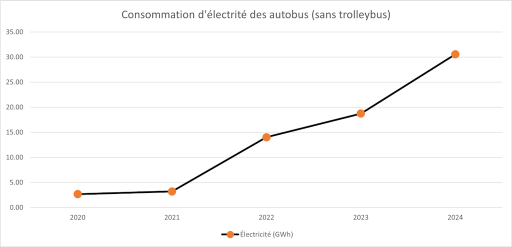 Entre 2020 et 2024, la consommation d’électricité des autobus (trolleybus non compris) a augmenté d’un facteur 10. Ceci est une conséquence de l’électrification progressive des flottes. La proportion d’électricité reste cependant modeste et représente 5 % de l’énergie totale – environ 9 % de tous les bus en circulation sont des bus à batterie (état 2024).