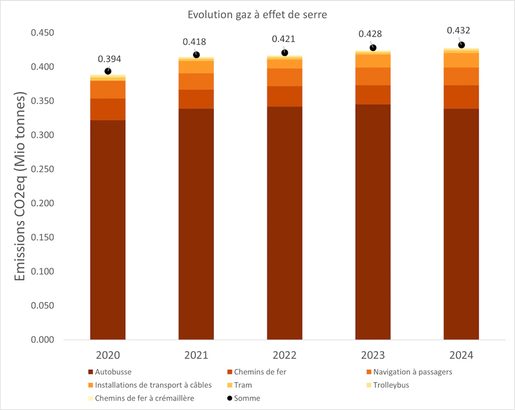 Entre 2020 et 2024, les émissions de gaz à effet de serre du transport voyageurs ont augmenté en continu de 0.394 à 0.432 Mio de tonnes en 2024 (+10 %). Les émissions des installations à câbles n’ont pu être calculées qu’à partir de 2021, aucune information sur le mix énergétique n’étant disponibles pour 2020. C’est ce qui explique l’augmentation plus marquée entre 2020 et 2021.
