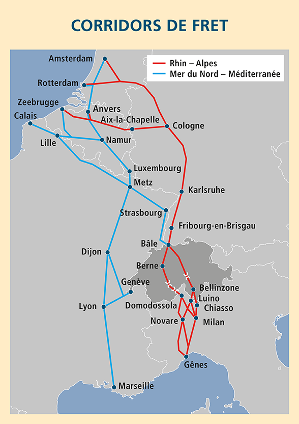 Les corridors Rhin-Alpes entre Rotterdam et Gênes (via le Loetschberg-Simplon et le Saint-Gothard-Ceneri) et mer du Nord-Méditerranée entre Anvers et Lyon/Bâle sont les axes principaux pour la Suisse.