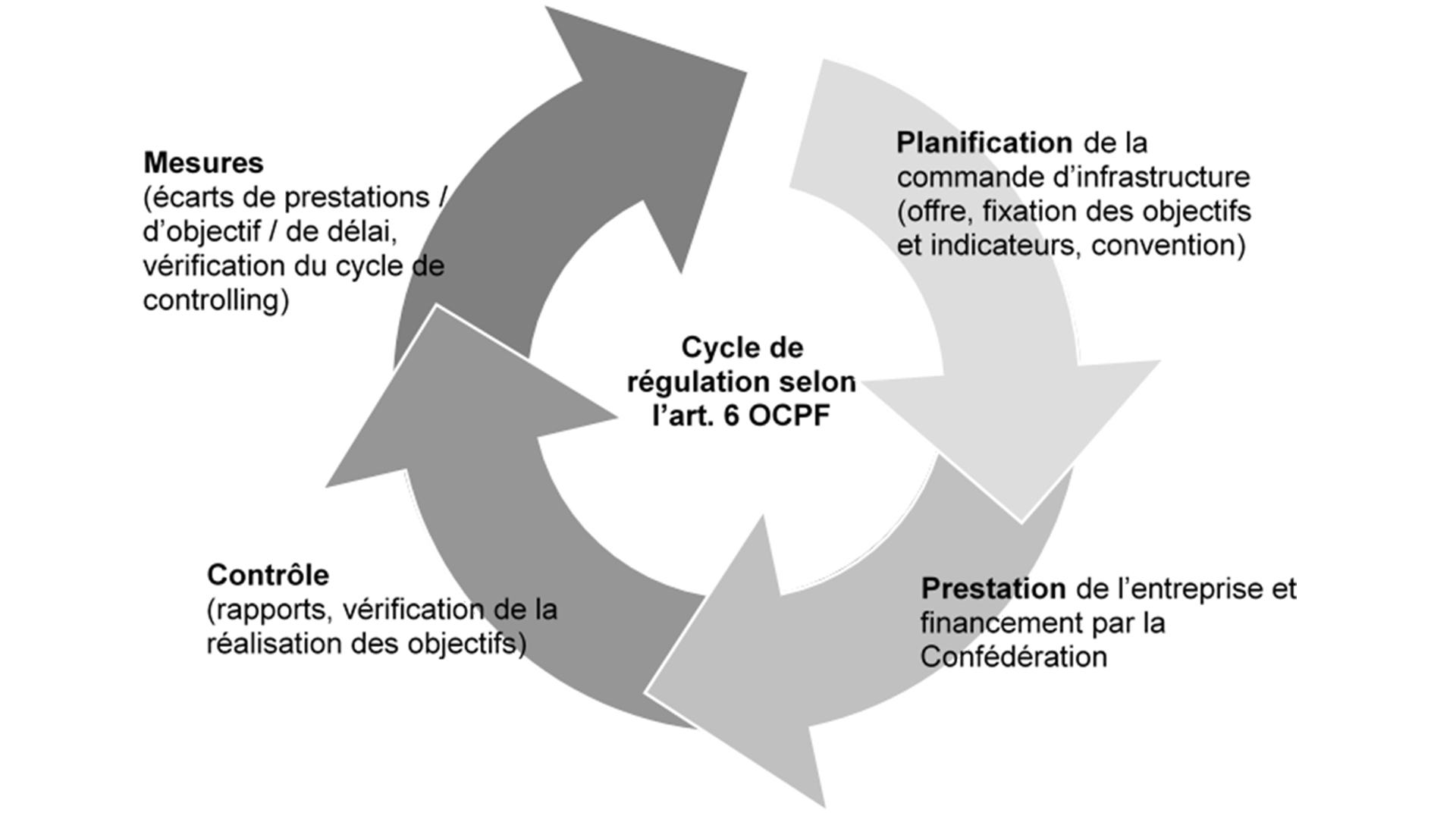 L’OFT pilote les CP à l’aide d’un controlling. La réalisation des objectifs est évaluée quantitativement à l’aide d’indices orientés sur l’efficacité. Par ailleurs, les chemins de fer doivent rendre compte d’autres objectifs (état du réseau, taux d’utilisation et sollicitation du réseau, ETCS, etc.). Ils doivent présenter au moins tous les six mois un rapport sur la réalisation des objectifs et l’état d’avancement des projets d’investissement. L’OFT peut ordonner des mesures ou demander le remboursement de paiements si les prestations commandées ne sont pas fournies comme convenu, si les objectifs ne sont pas réalisés ou si les délais impartis ne sont pas respectés.