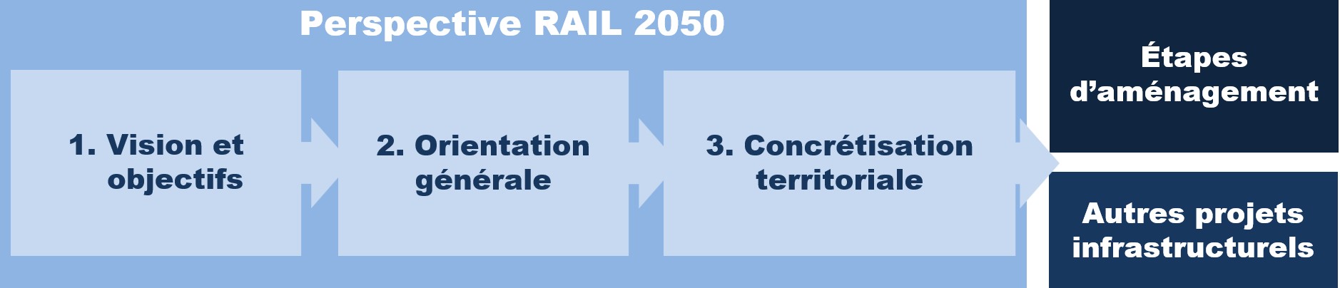 Partant d’une vision et de six objectifs, la Perspective RAIL 2050 définit l’orientation générale du futur aménagement du rail en Suisse.