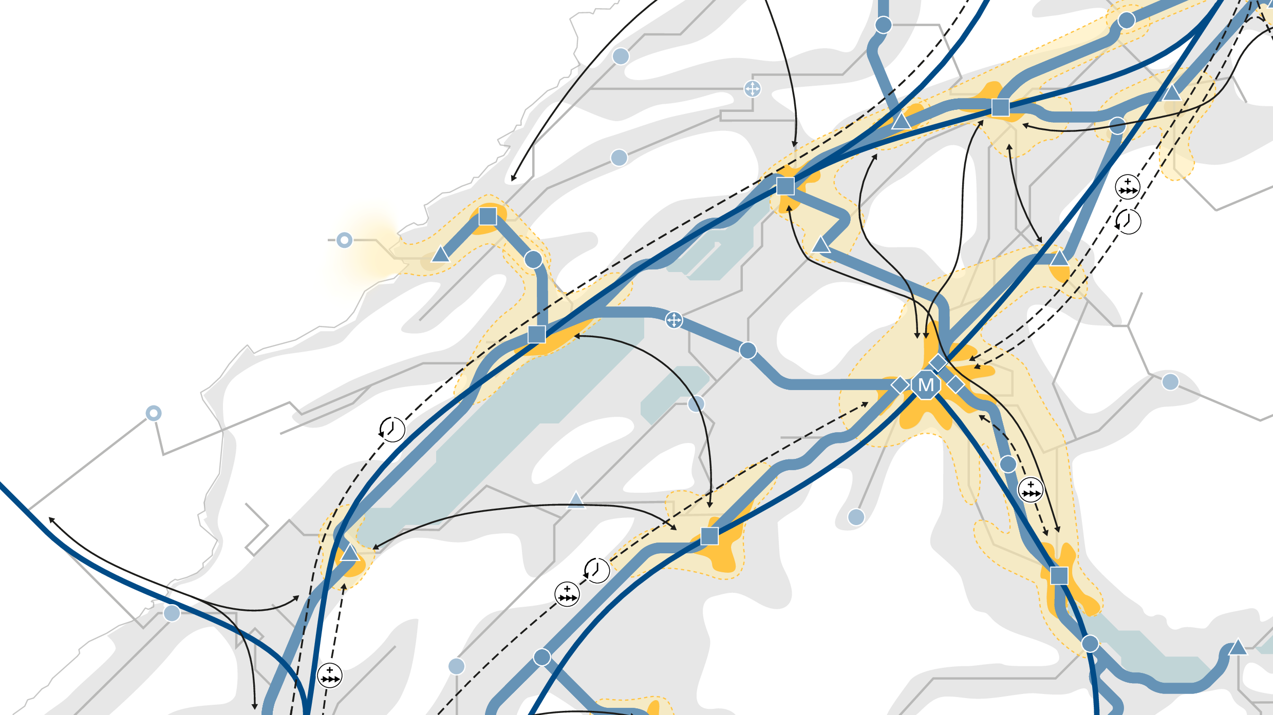 La concrétisation territoriale de la Perspective RAIL 2050 ne constitue toutefois pas encore un projet d’offre incluant des déclarations sur le réseau de lignes, la densité des cadences ou les horaires. Il s’agit d’une aide à la planification dans le cadre du processus PRODES, qui garantit que les objectifs d’offre sont alignés sur la vision et les objectifs de la stratégie à long terme.
