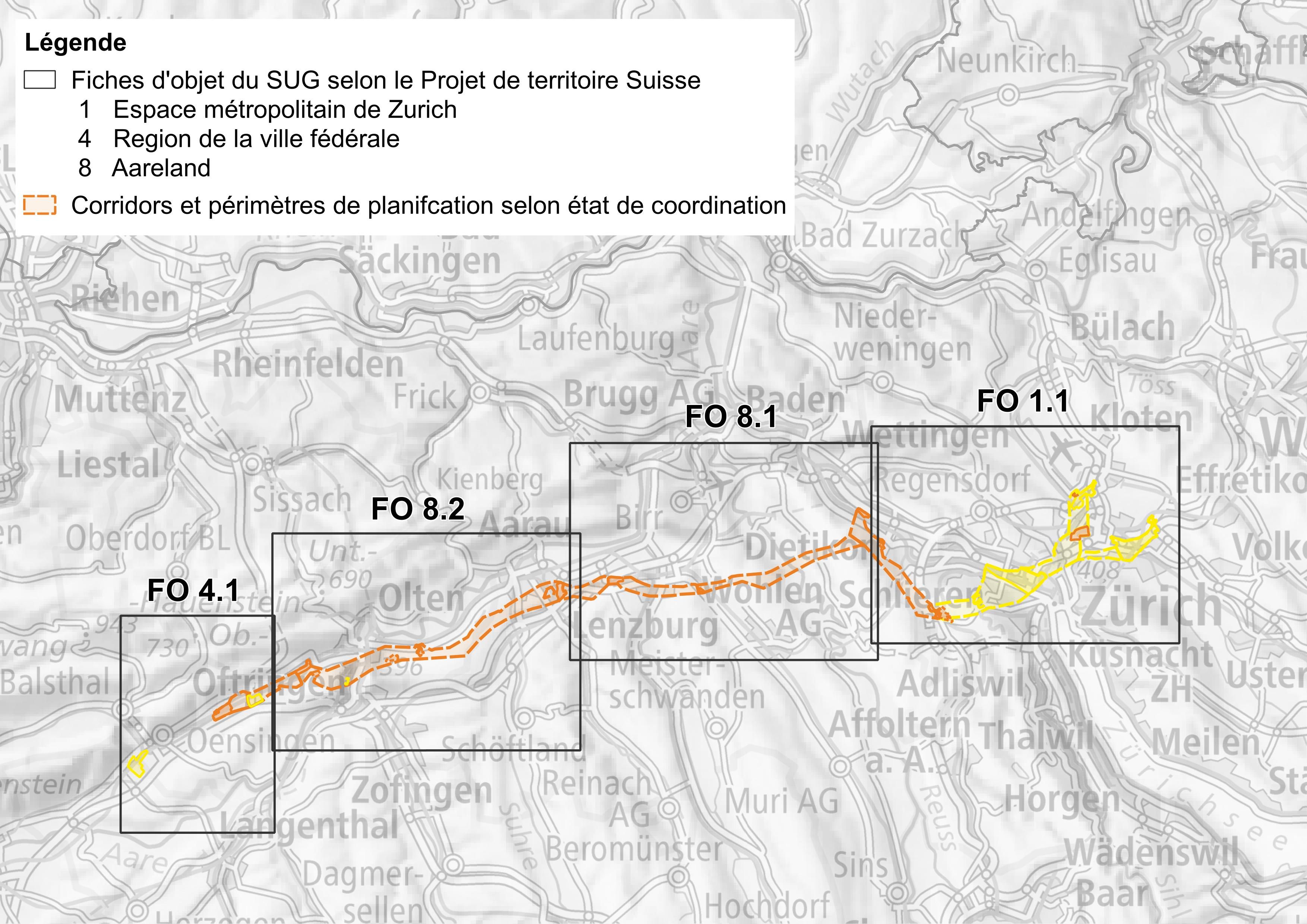 Les quatre fiches d’objet du SUG contiennent le corridor dans lequel la future installation doit se situer, ainsi que les périmètres des centrales de distribution (hubs) pour la section prévue entre Härkingen et Zurich. Les cantons définissent le tracé concret du tunnel ainsi que l’emplacement des hubs dans leurs plans directeurs. Par ailleurs, les emplacements des attaques intermédiaires pendant la construction ainsi que les décharges spécifiques au projet sont définis dans les fiches d’objet.