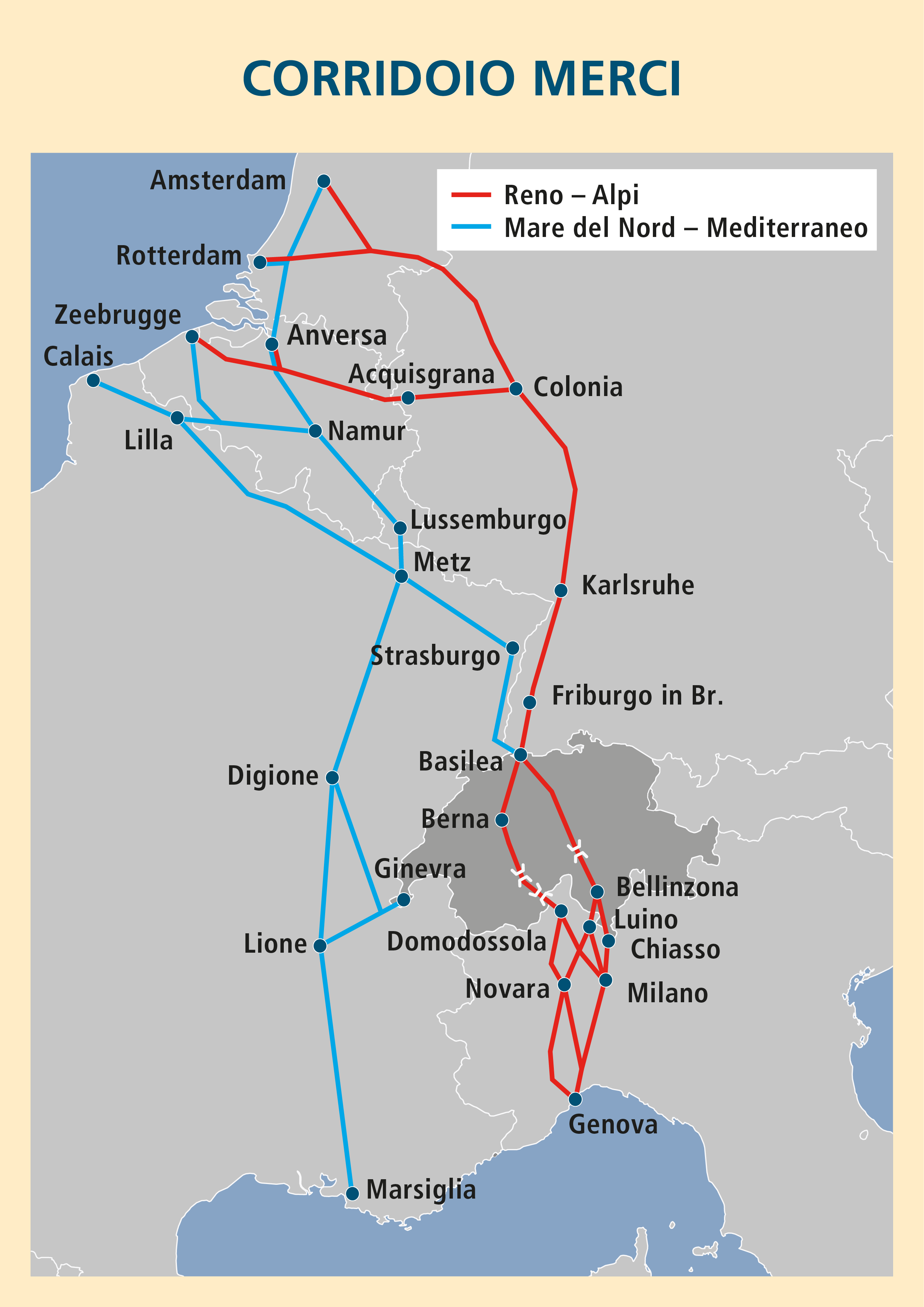 In questo contesto, i gestori dell’infrastruttura sono tenuti a collaborare strettamente con i partner dei Paesi vicini. In tal modo, i corridoi assumono la funzione di polmoni e arterie di una rete ferroviaria europea efficiente per il traffico merci. I corridoi Reno-Alpi tra Rotterdam e Genova (via Lötschberg-Sempione e San Gottardo-Ceneri) e Mare del nord-Mediterraneo tra Anversa e Lione/Basilea sono gli assi principali per la Svizzera.
